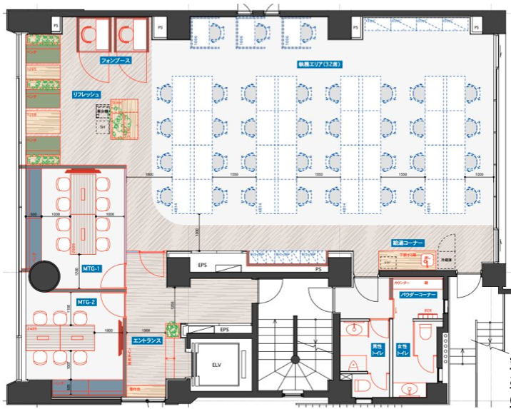 ファミレスブース、テレカンブース×2完備 (※執務室什器はつきません)